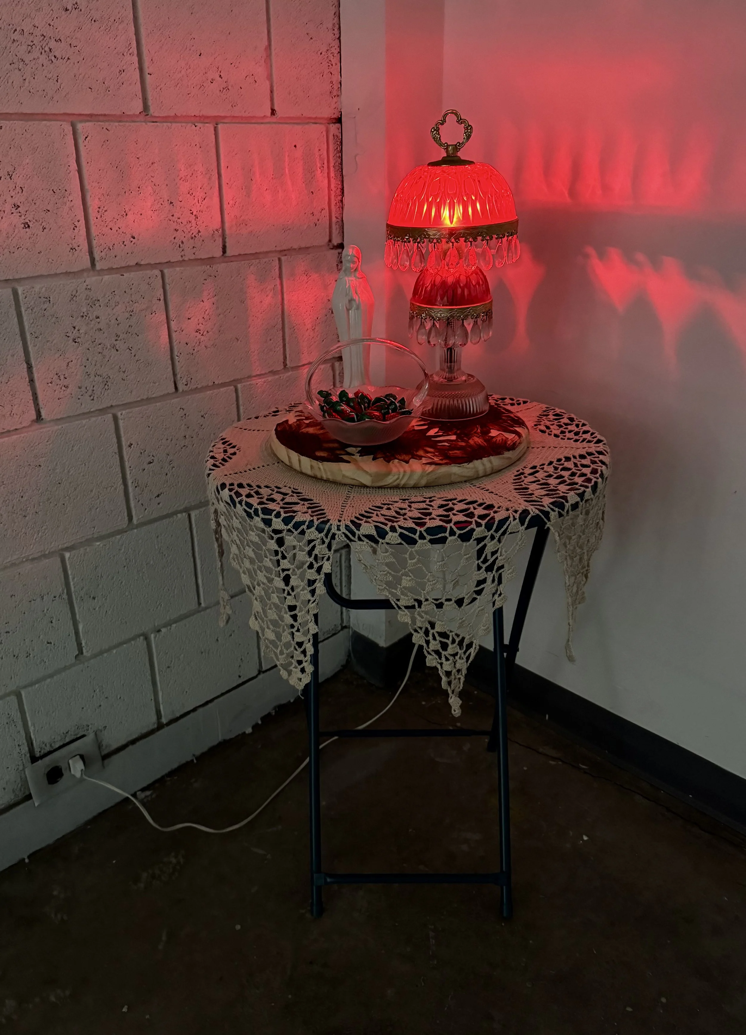 Medium: Mixed media installation containing a vintage lamp, glass, wood, textile, candy, and found objects