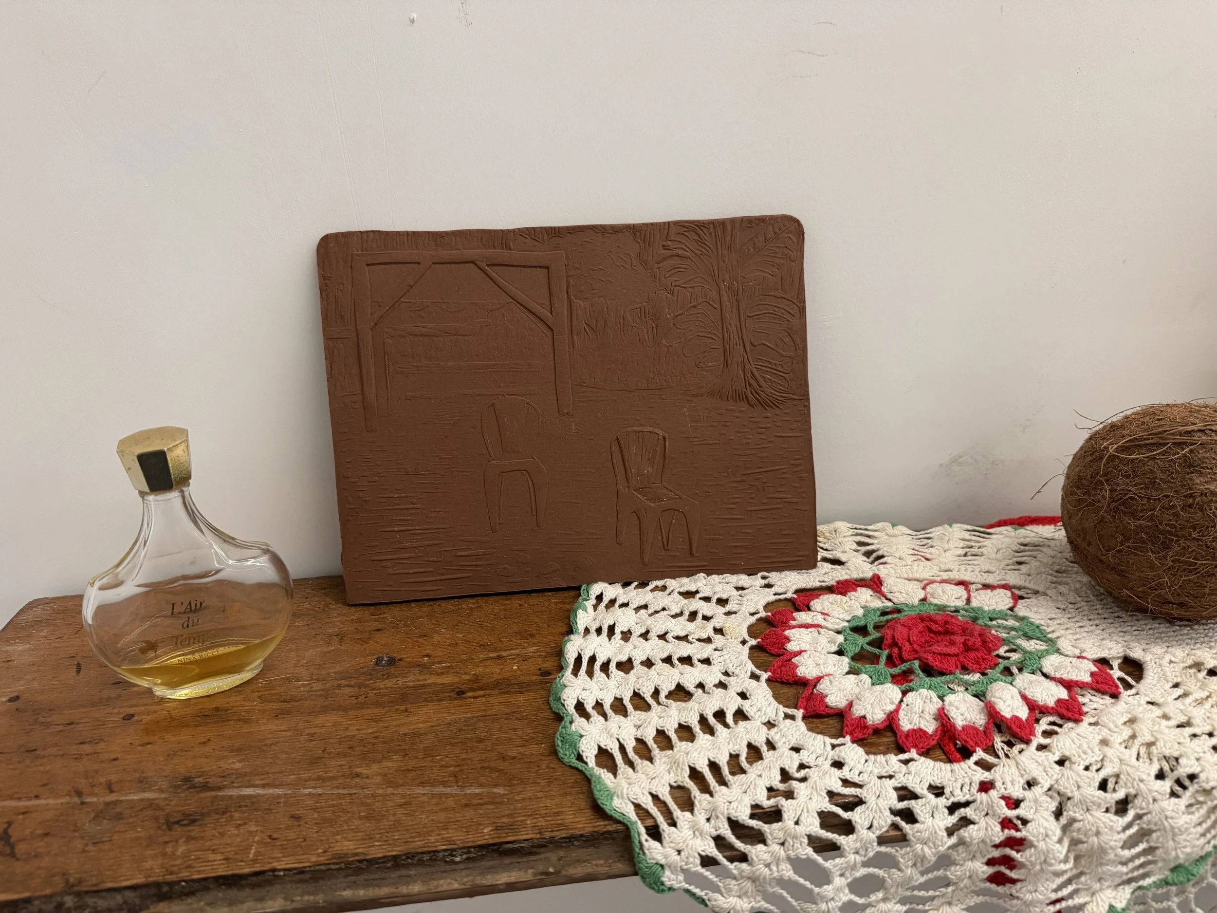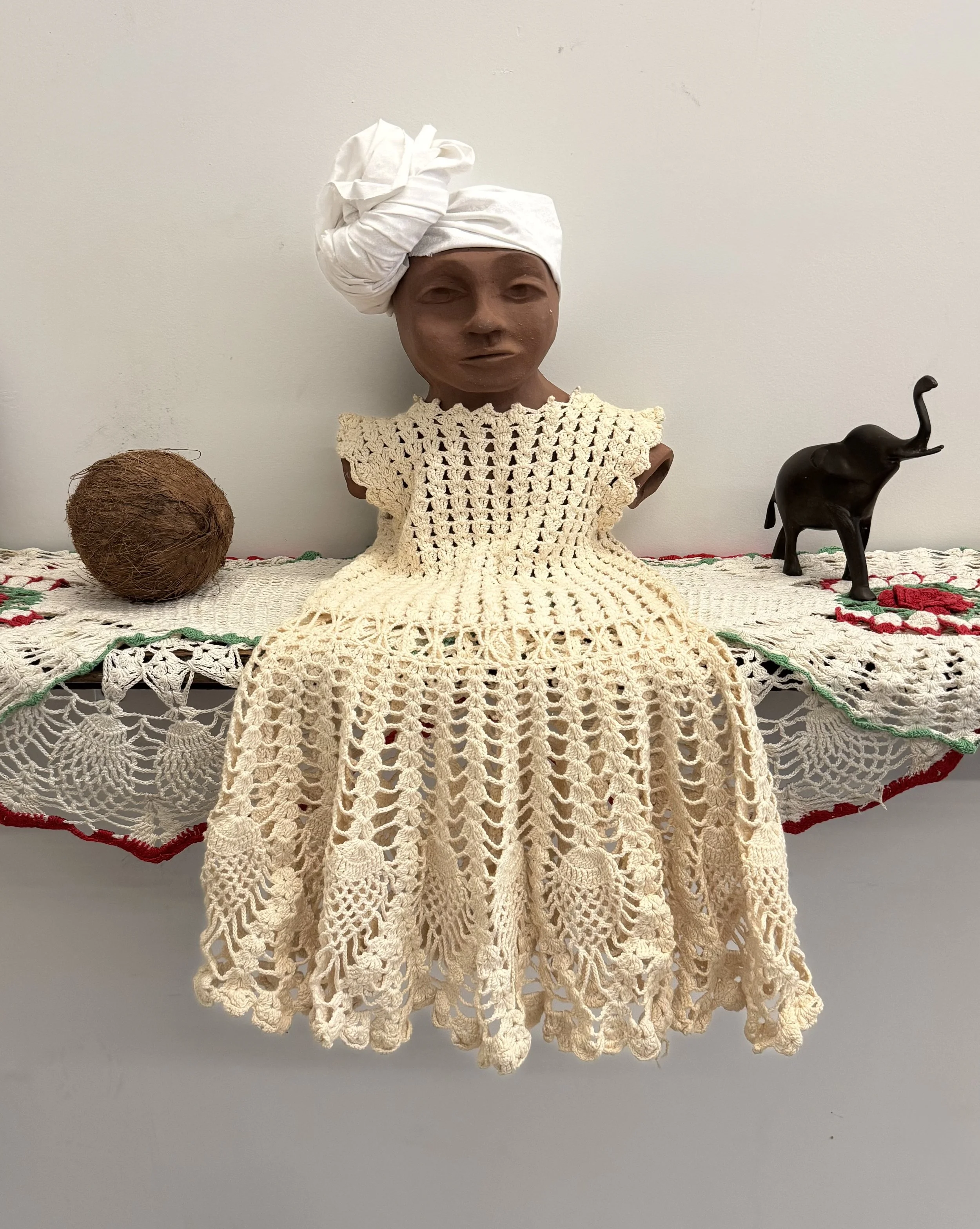 Medium: Mixed media installation containing wood flooring, clay, textile, crochet, found objects, bronze, coconut, and archival materials